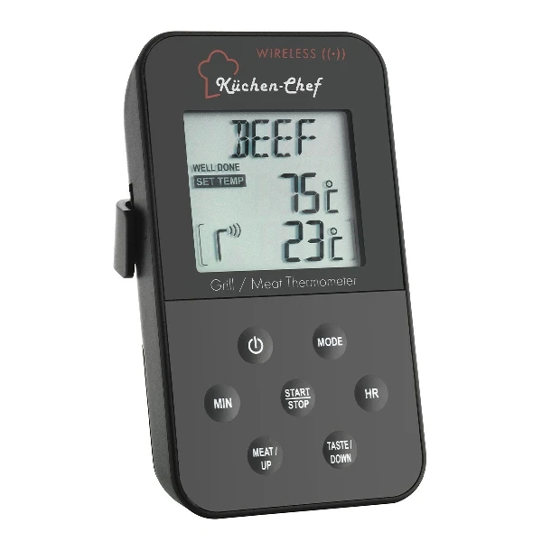 Termometro e timer digitale radiocontrollato per barbecue.