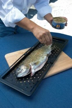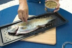 Questo vassoio ha la particolarità di essere allungabile, adattandosi a tutto, dai filetti di pesce, al salmone intero fino ai filetti di manzo interi, senza sprecare più spazio del necessario sulla griglia.
